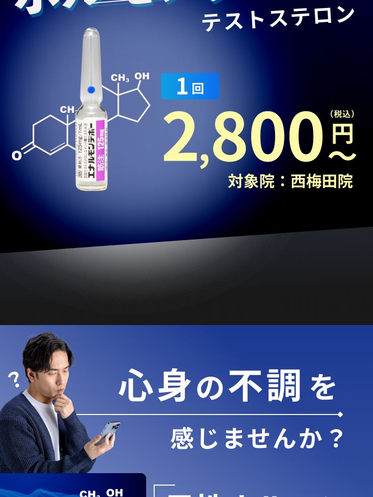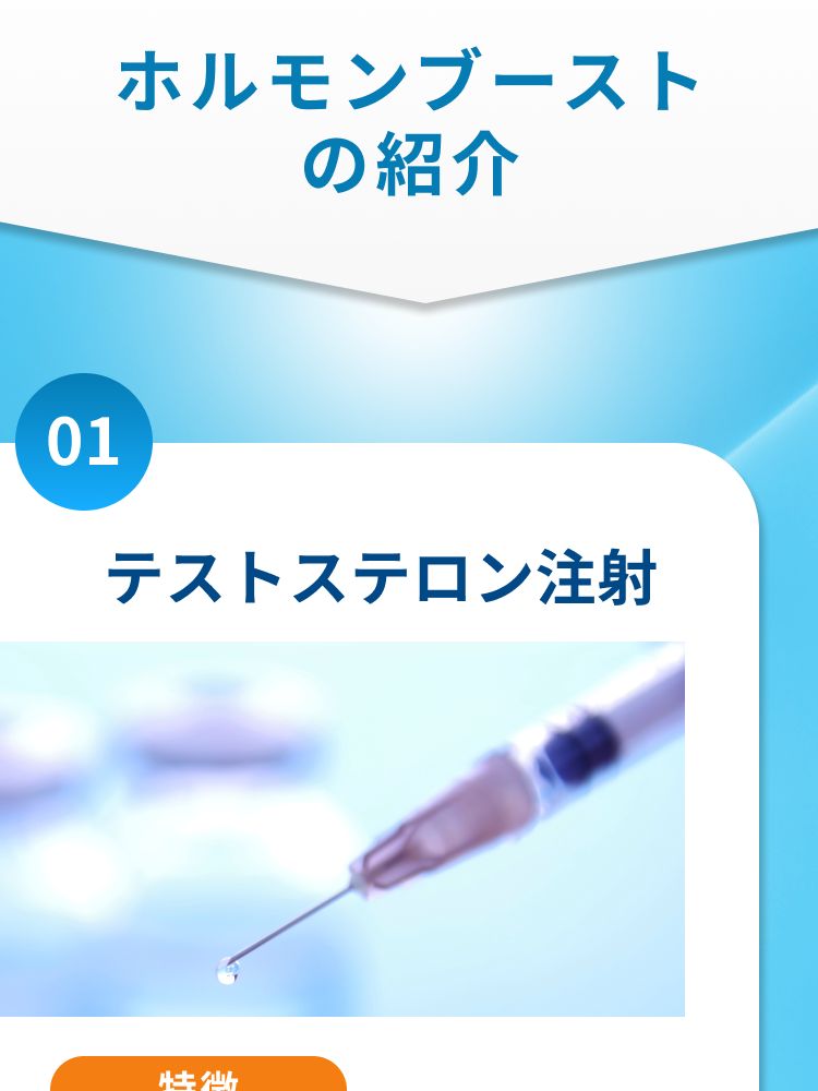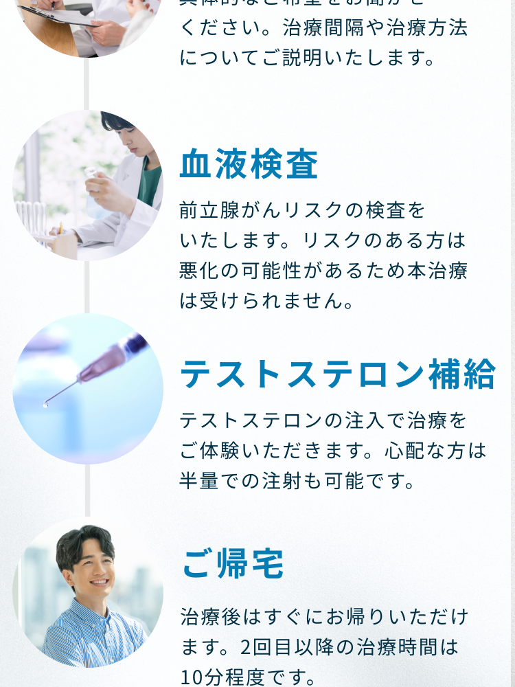 テストステロン補充療法を終了するタイミングは個々人の状況によって決定します。注射の場合は3~4週間に1度行います。その都度治療の成果を確認し、治療を継続するか終了するかを検討します。