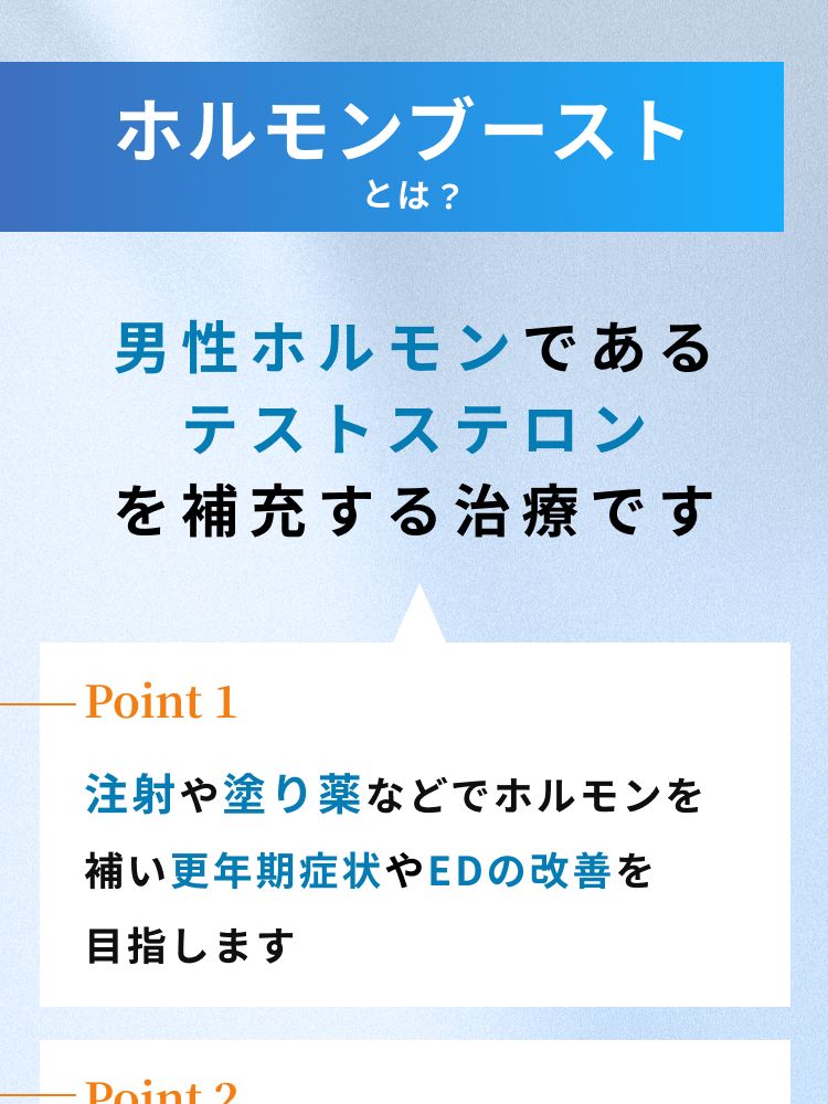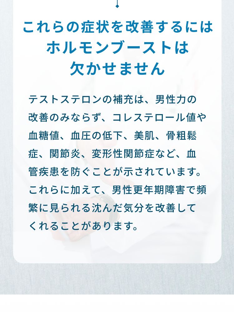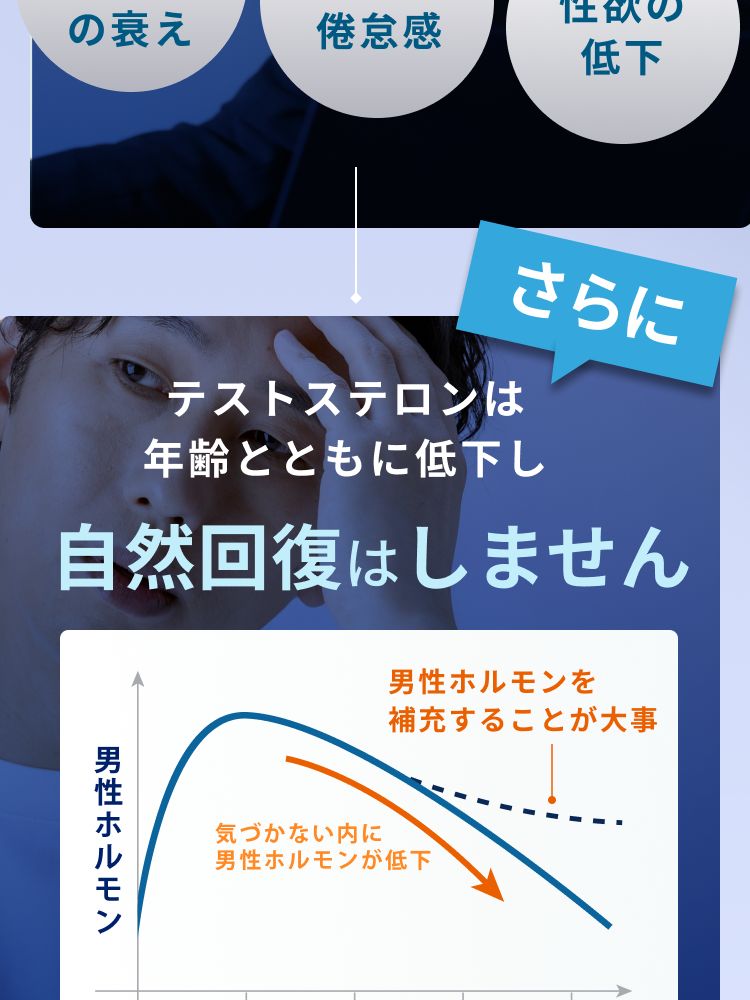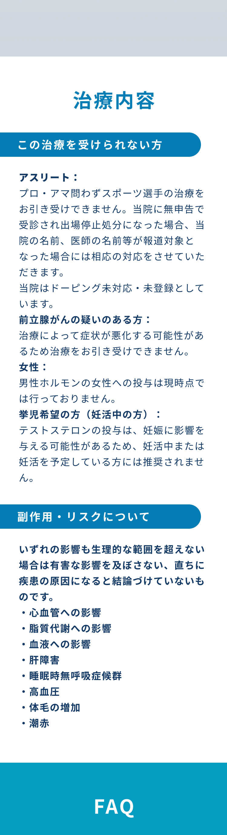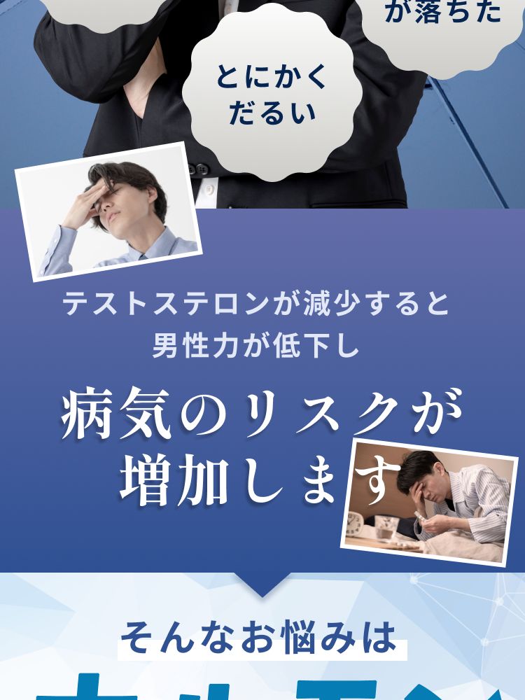 テストステロン自体は、AGAの直接的な要因ではありません。ただし、もともとAGAと診断されている方の場合は、進行が早まる可能性があります。すでにAGA治療薬を服用されている場合は、基本的には問題ありません。