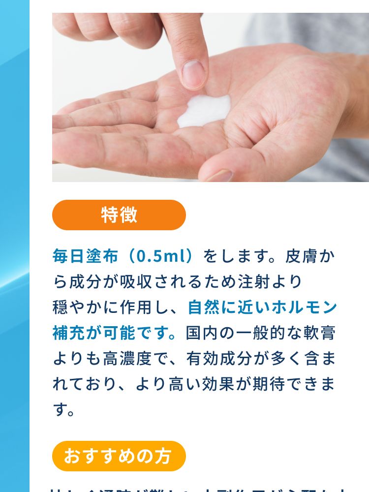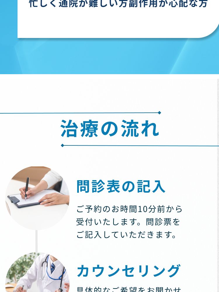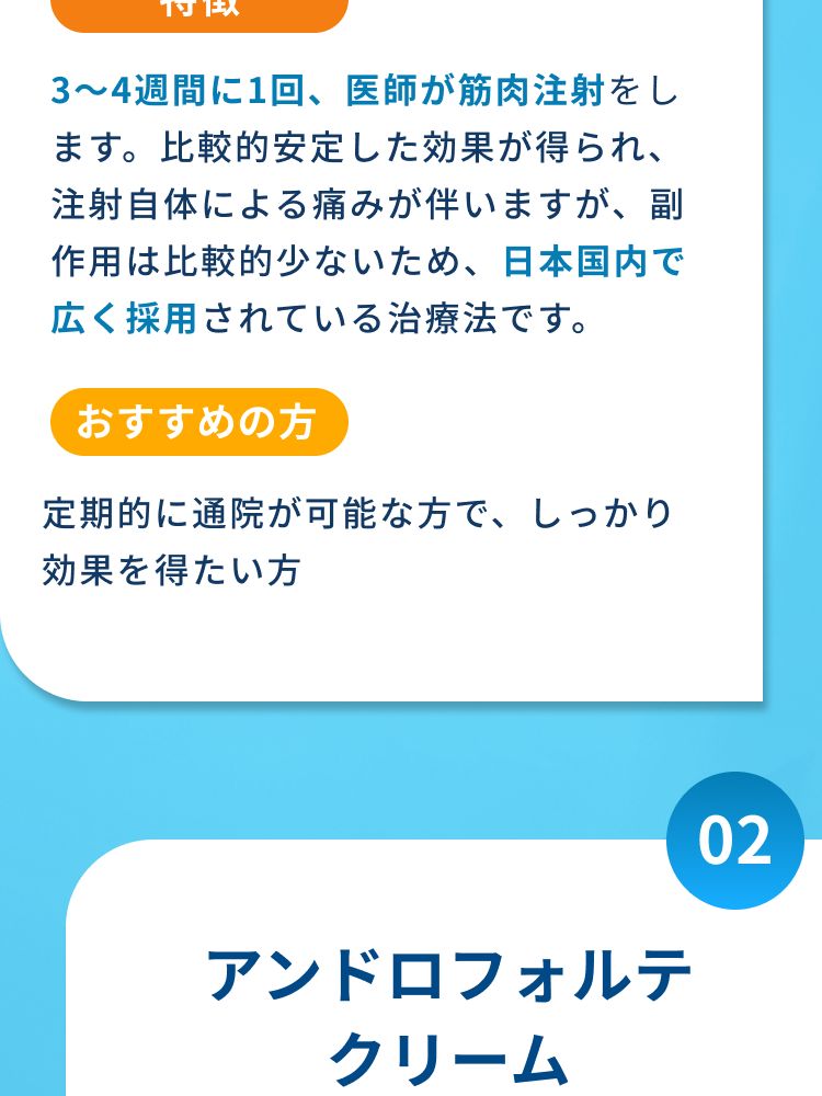 個人差はありますが、治療開始から約3ヶ月程度で、多くの方が実感し始めると言われています。筋力トレーニングと組み合わせる事で、本格的な増量効果が期待できます。
