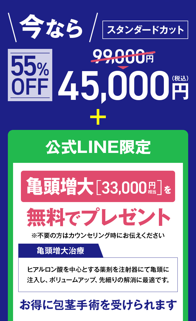 真性・カントン包茎は対応不可真性包茎やカントン包茎の治療には対応しておりません。仮性包茎のみ対応していますが、仮説包茎の場合でも重度の場合は、改善することが難しい場合があります。