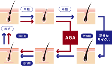 AGAになると、ヘアサイクルのうち成長期が短くなります。AGAはジヒドロテストステロン(DHT)の影響によるヘアサイクルが原因で引き起こされます。