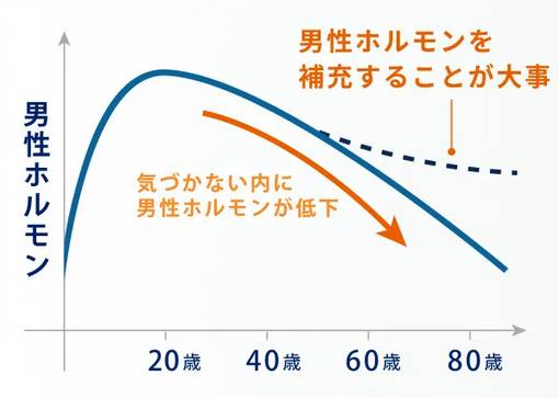 テストステロンは加齢により低下し、自然回復はしません。そのため男性ホルモンを補充することが大事です。